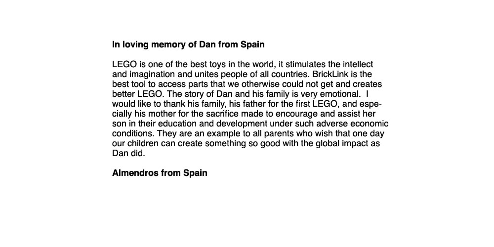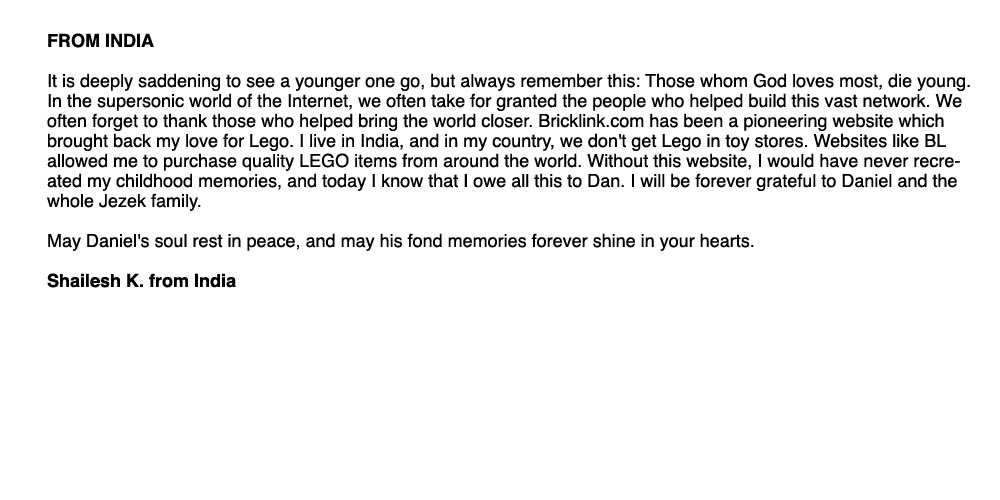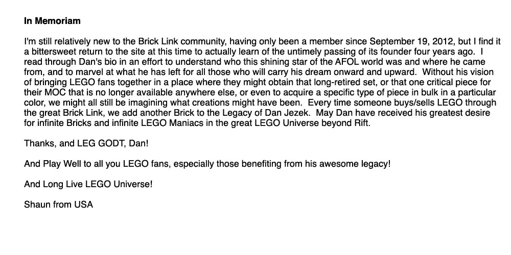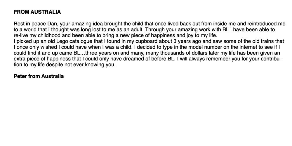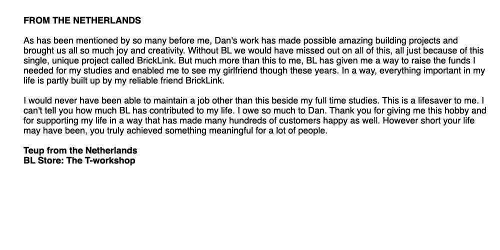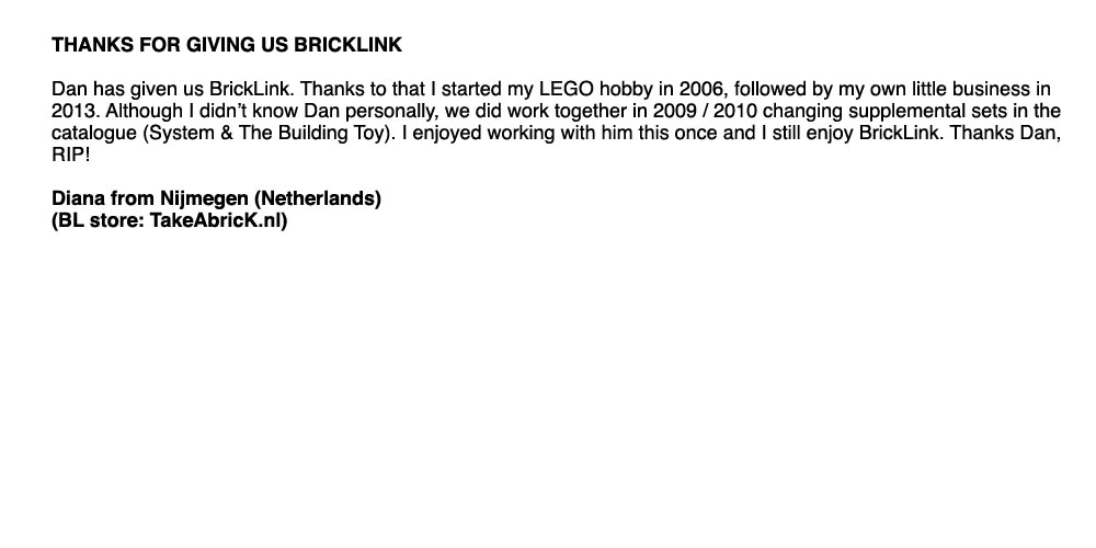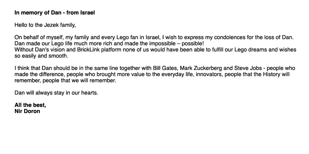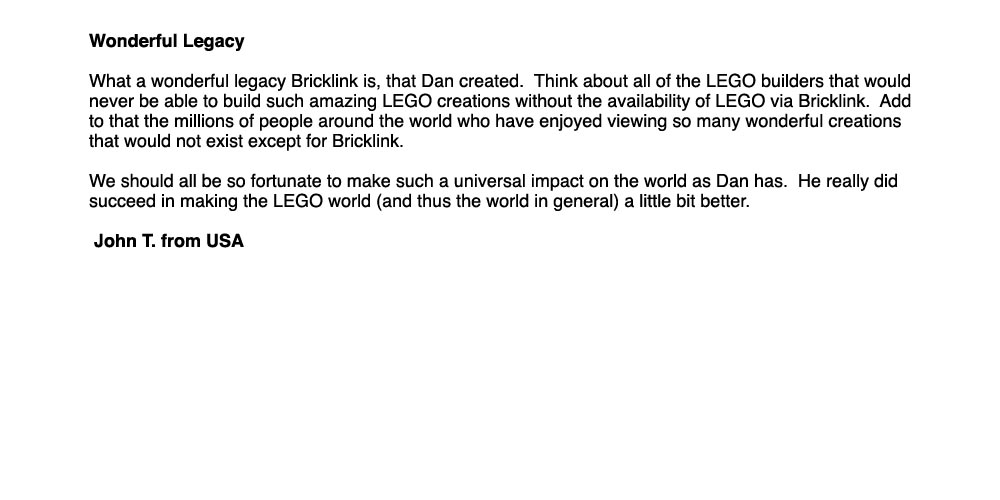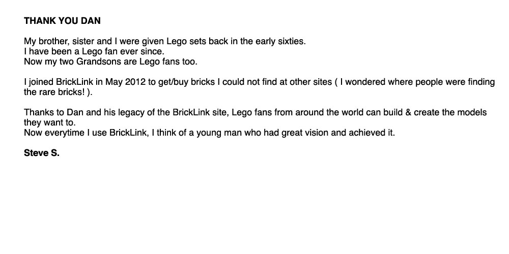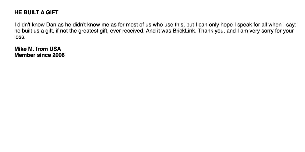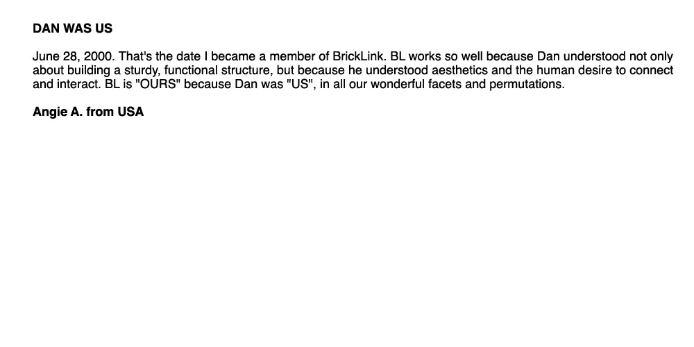 Above, below and column right are remembrances from around the world of Dan and BrickLink. Members of BrickLink are invited to comment regarding the impacts Dan and BrickLink have had on their lives. Please feel free to share your own thoughts regarding Dan and his dream: Leave a message