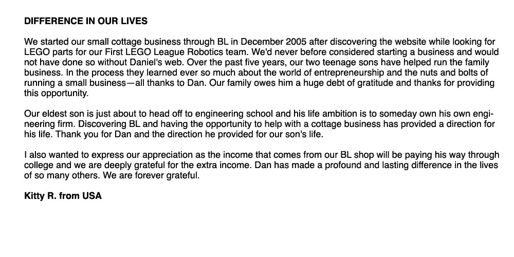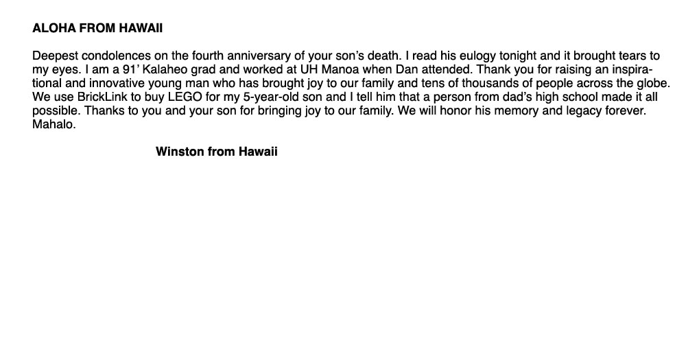 BrickLink has made it possible for my son and my four grandkids to enjoy LEGO time together. The site has been invaluable and continues to be the main resource we use. Your son, Dan, remains a living and vibrant personality throughout his site and I marvel at your young man, who like my son, took to computers and made them his own. My son, a teacher of English to high school children, once remarked to me that he wanted to “make a difference with a few young minds.” Your son has certainly made his mark with a LOT of young minds. How you must smile!