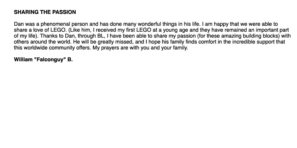 Dan created an amazing website for all fans of LEGO. He has left his mark on this world, and all of us are better for it. Thank you for keeping his dream alive.